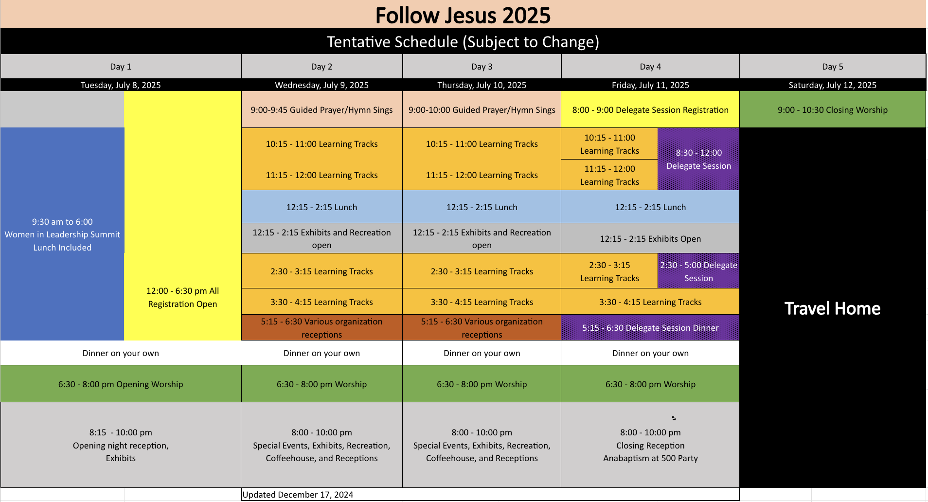 Follw Jesus 25 kicks off with worship beginning at 6:30 p.m. on July 8. A typical day includes worship and seminars. Throughout convention, attendees have the option to visit the exhibit hall or recreation hall; or fellowship with other attendees. The final worship will be on the morning of July 12.